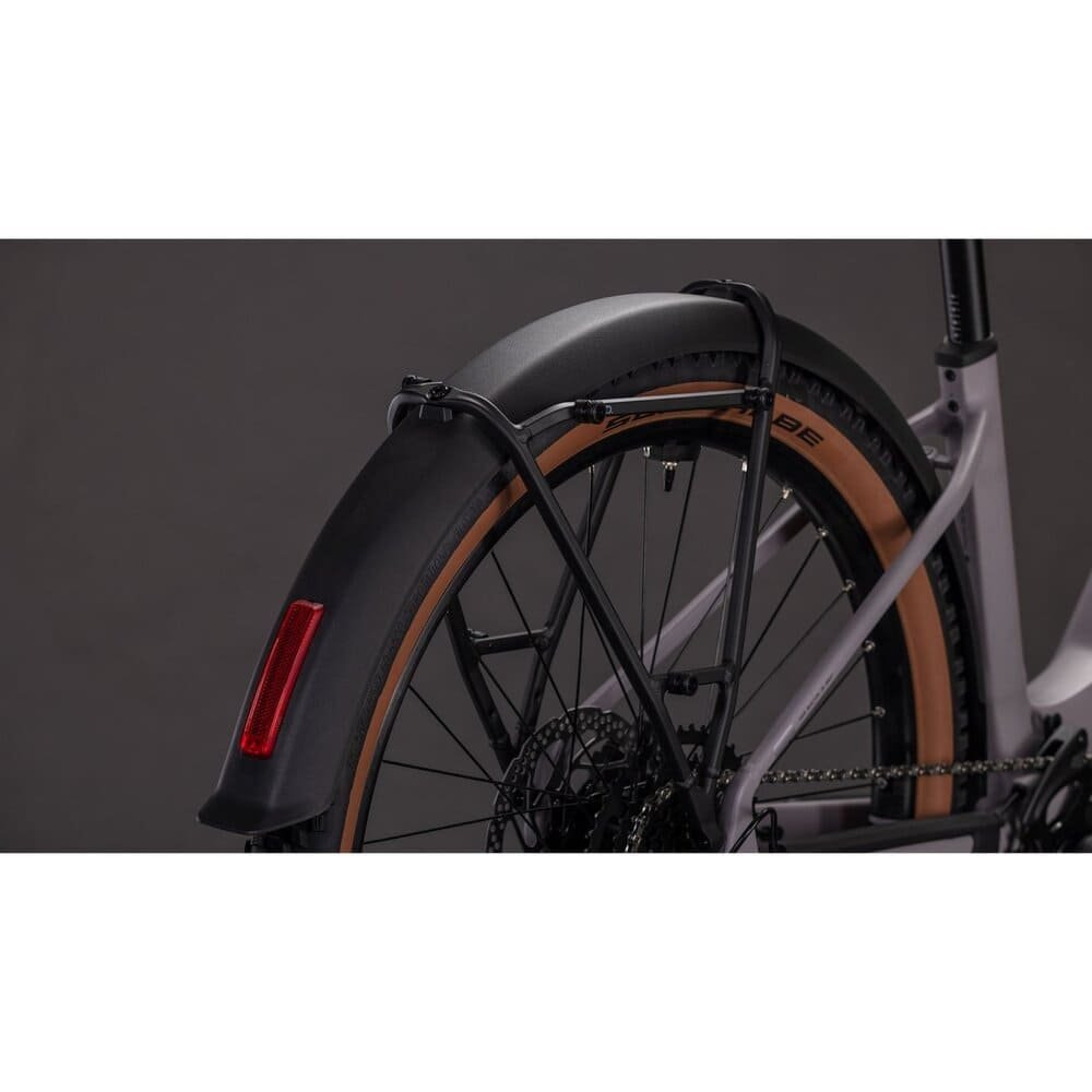 Außerdem haben CUBE dem Bike eine Federgabel mit 100 mm Federweg spendiert, die Schlaglöcher in der City und Ruckler auf dem Trail souverän glattbügelt. Dazu griffige Schwalbe Smart Sam 2.6 Zoll Reifen, einen bequemen Sattel und bequeme Griffe für konstant hohen Fahrkomfort. Last, but not least gibt es umfangreiches Zubehör in Form von Schutzblechen, Lichtern, Gepäckträger und Seitenständer.