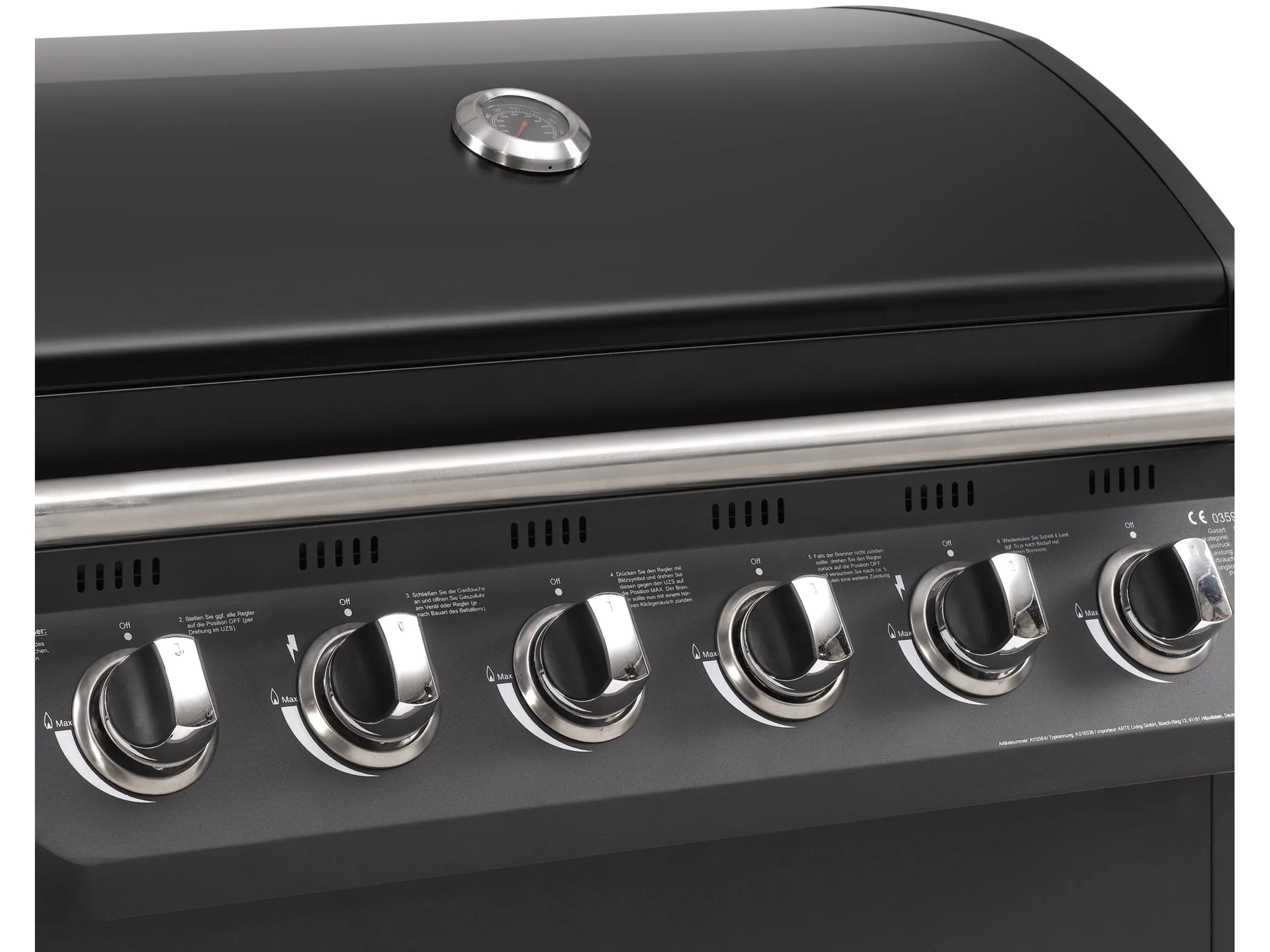 Monster-Grill für große Parties! 6 Brenner à 3,2kW = 19,2kW Power, Seitenbrenner für Saucen top. XXL-Rost 80x45cm, gleichmäßige Hitze, Schwarz edel!