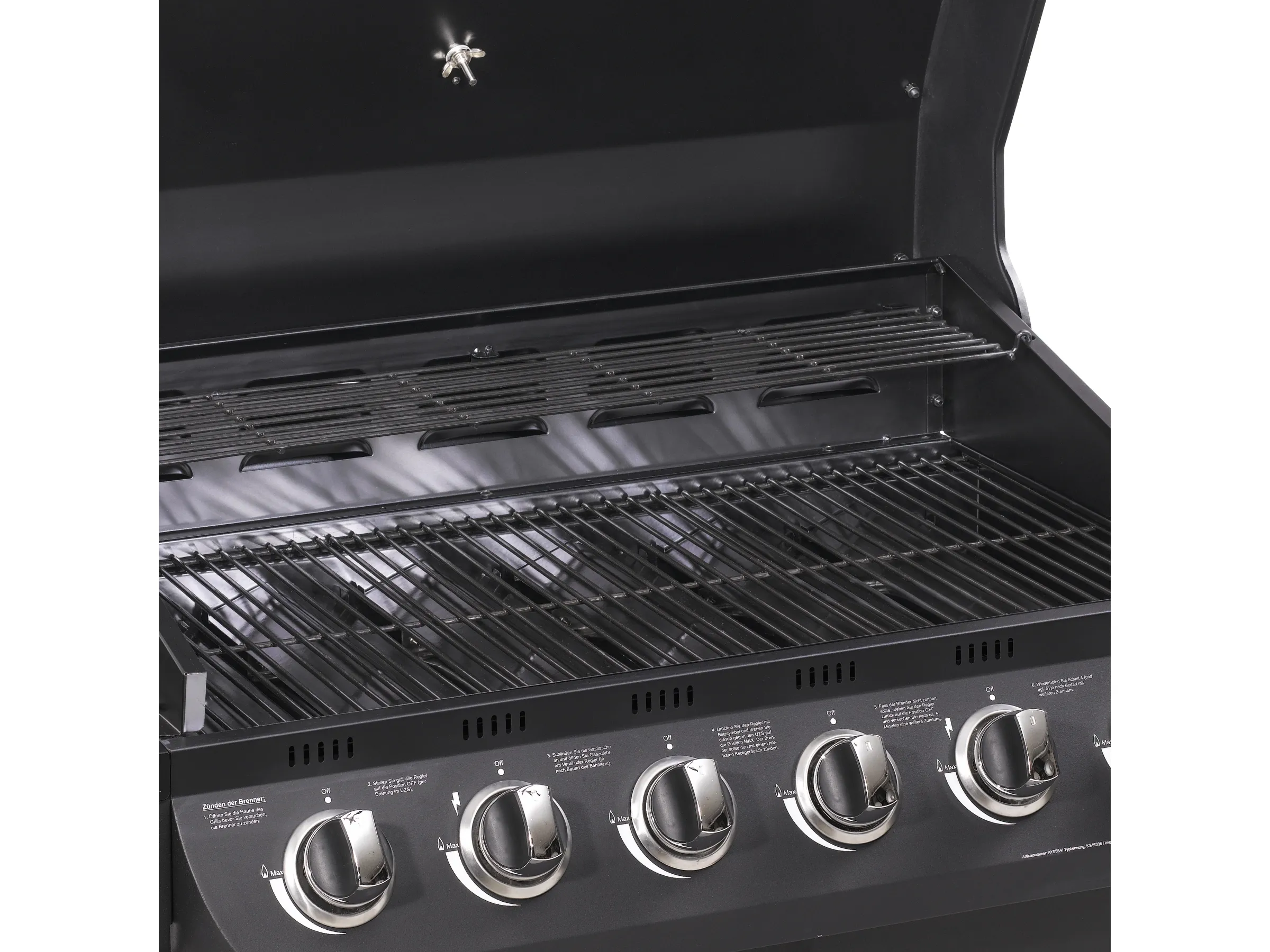 Der Columbus 6 Brenner besticht durch eine elegante Schwarz-Silber-Kombination, die modern wirkt und gleichzeitig sehr funktional ist. Sein Gehäuse besteht aus robustem, pulverbeschichtetem Stahl, der für seine Widerstandsfähigkeit gegen Hitze und Witterung bekannt ist. Die Konstruktion ist sorgfältig ausgeführt: stabile Scharniere am Deckel, solide Metallscharniere und massive Schraubverbindungen garantieren eine langlebige Konstruktion, die auch bei intensiver Nutzung zuverlässig funktioniert.