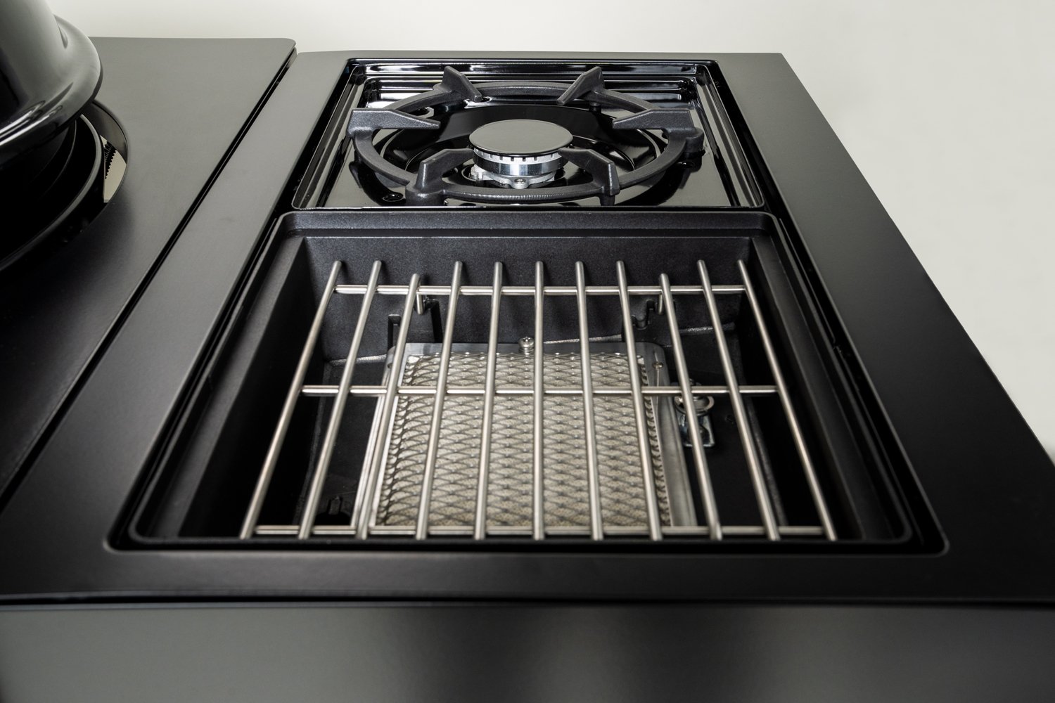 Das Modell Evo Plus ist im Vergleich zum Modell Evo direkt mit der, normalerweise optionalen, Blazing-/ Cooking Zone ausgestattet. Das große Seitenteil beinhaltet einen Infrarotbrenner für Temperaturen von bis zu 900°C sowie einen Seitenkocher für die Nutzung mit Töpfen und Pfannen.